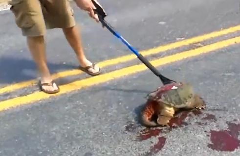 男子以为鳄龟已经死去,打算收拾一下惨死的尸体,没想到他拿工具刚刚触碰到鳄龟时,鳄龟发出反击,张嘴向男子的工具咬去!