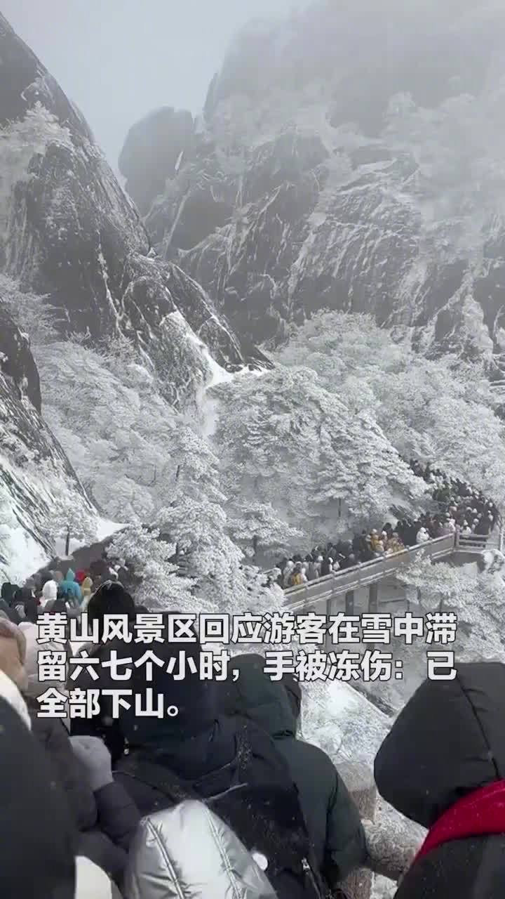据西部决策, 1月24日,安徽黄山。林女士反映在黄山游玩时,下山时因人流量大,在零下15度的环境中,滞留五个半小时。25日,景区工作人员回应,春节加下雪导致拥堵,但都安全将游客送下山了,买到票的游客可以正常游玩。#景区回应黄山降雪游客称滞留5小时#