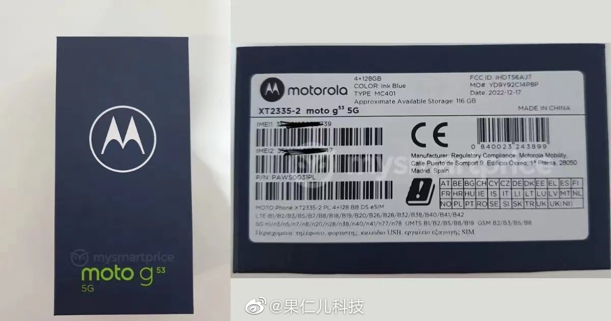 国外媒体MySmartPrice分享了Moto G53 5G 的真机和包装图。摩托罗拉预计在近期举办新品发布会,并且将推出Moto G13、Moto G23、Moto G53 5G 和 Moto G73 5G 在内的多款设备。