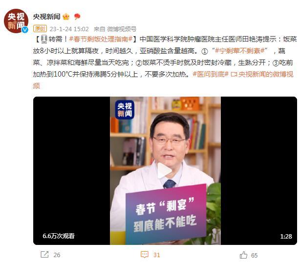 中国医学科学院肿瘤医院主任医师田艳涛提示:饭菜放8小时以上就算隔夜,时间越久,亚硝酸盐含量越高。①宁剩荤不剩素#,蔬菜、凉拌菜和海鲜尽量当天吃完;②饭菜不烫手时就及时密封冷藏,生熟分开;③吃前加热到100℃并保持沸腾5分钟以上,不要多次加热。