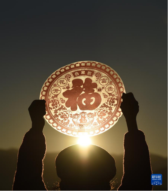 1月22日,在云南省大理州剑川县马登镇文屏村,村民举起福字,迎接新年第一缕阳光,寓意“福迎新春”。