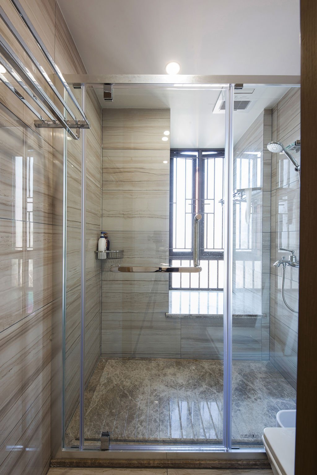 卫浴间不再非黑即白,选择带咖色的独特的横纹墙砖,光泽度高,使整个空间更显宽敞明亮,整体显得格外的时尚大方。