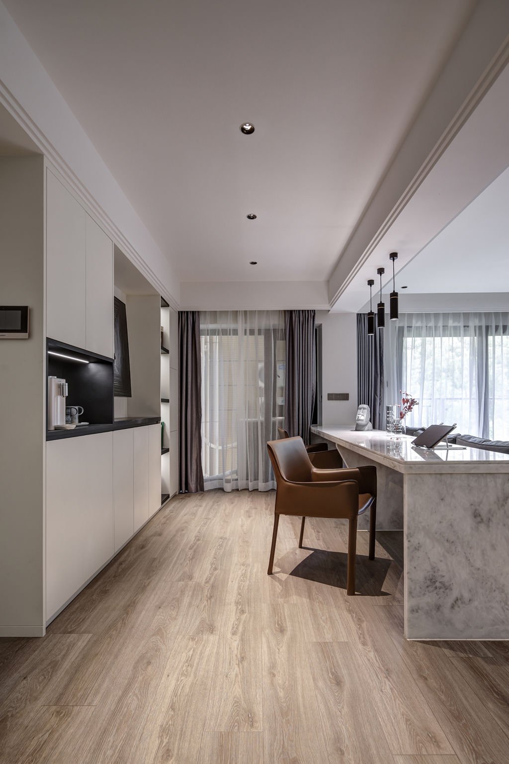 沙发背后的区域可视为开放式书房,大理石吧台为办公台,可供两人同时办公、打游戏使用。其后是黑白色的到顶收纳柜,色彩与空间相互呼应,视觉上也拉伸了空间高度,既独立又统一。