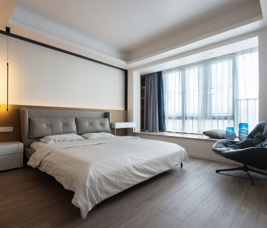 随动线进入卧室空间,氛围逐渐趋向平和。床头背景墙由米白色硬包和木色饰面组合而成,四周是黑色的细边铁艺,视觉上形成了一幅巨大的落地画,妙趣横生。