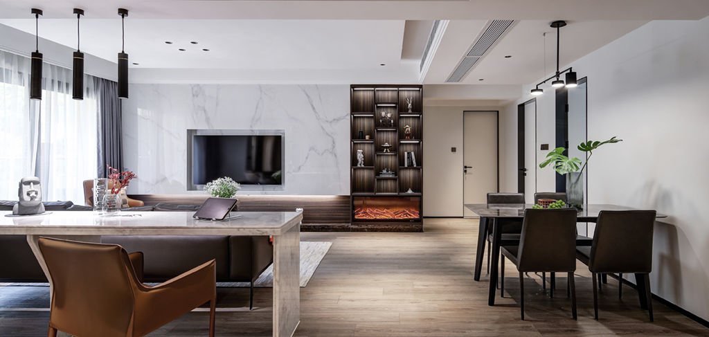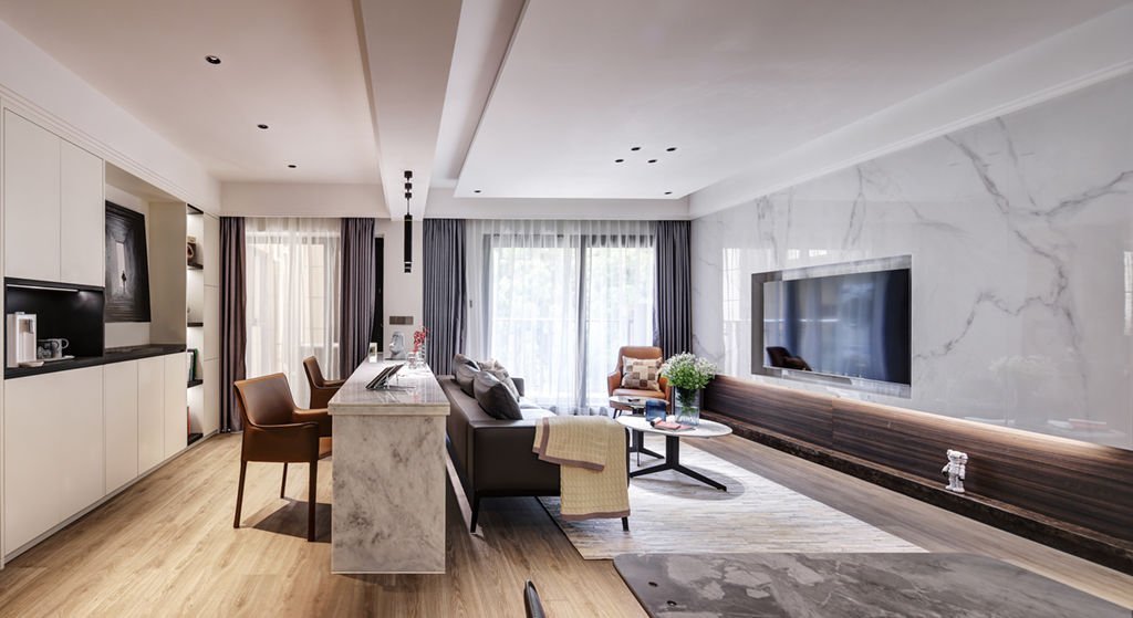 电视背景墙由大理石纹瓷砖+尤加利木饰面板+电子壁炉构成,无论是居家日用,还是待人接客,都不失典雅大气。
