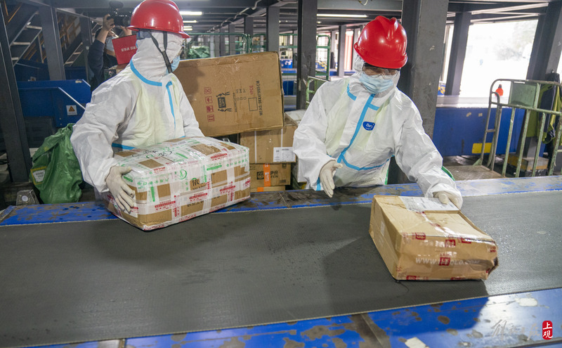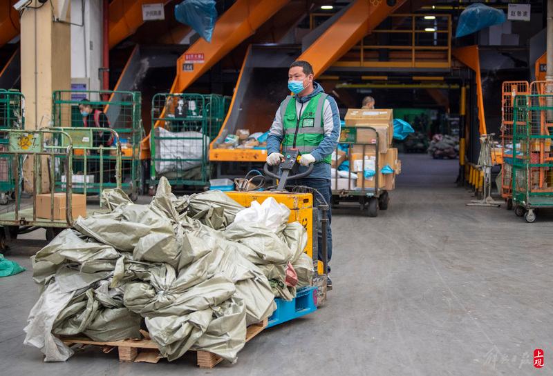2022年3月18日,上海市邮区中心工作人员正在全速处理快件。