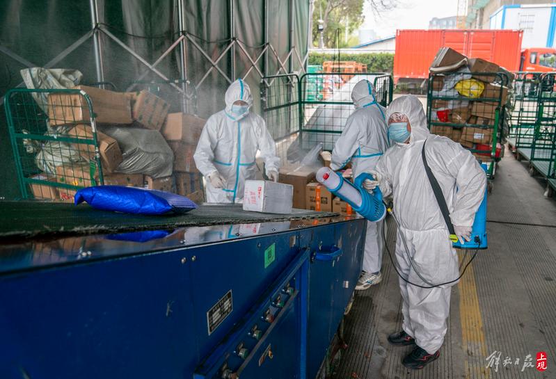 3月18日,上海市邮区中心工作人员正在对来自中高风险区域的快件进行消毒。