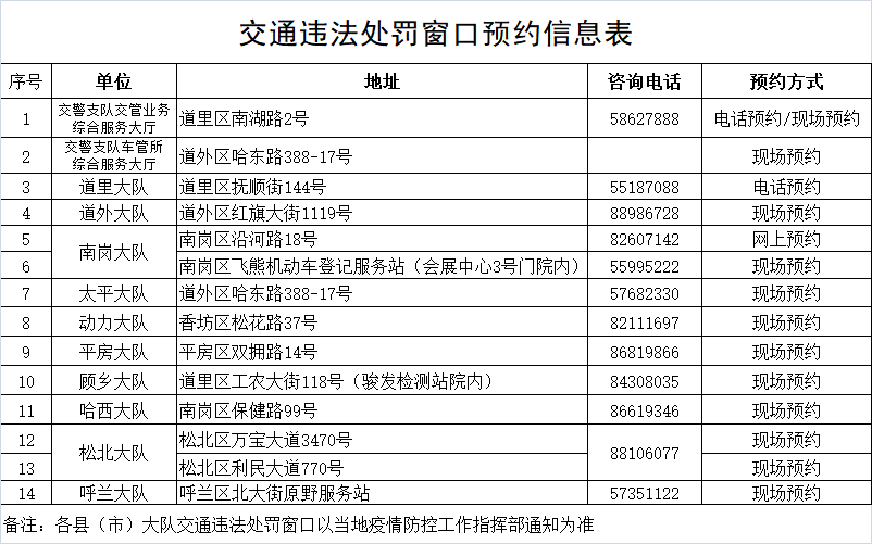 按照《哈尔滨市应对新型冠状病毒感染肺炎疫情工作指挥部第55号公告》要求,为做好公安交管车驾管及违法处罚业务服务窗口疫情防控工作,避免和减少人员聚集,哈尔滨市公安交管部门决定从3月21日起,对市区内相关交管业务窗口全面实行预约办理,现就将有关事项通告如下: